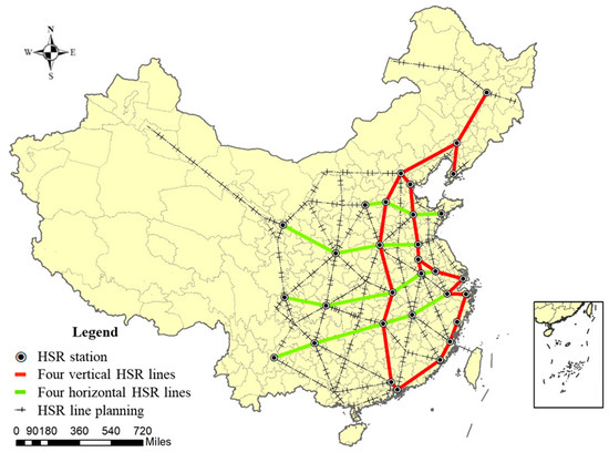 1]. Although China’s HSR construction started late, its development has been fast. After about two decades of construction, China has developed the HSR with the longest operating range, largest carrying capacity and largest geographical coverage in the world. According to information from the China Railway Corporation, ever since the first HSR line started operations in 2008, China had successfully constructed 25,000 km of HSR as of 2017, thus accounting for 66.3% of the world’s total HSR length. In addition, the HSR network framework of the Four Horizontal Lines and Four Vertical Lines layout was formed (