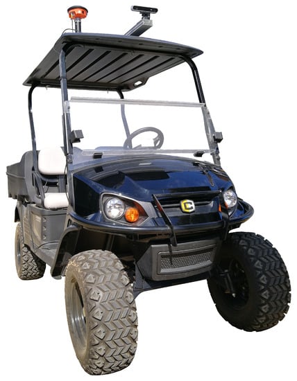 The electric machinery used in this work consisted of an electric golf cart, Cushman Hauler Pro, automated for agricultural purposes, powered by 58 V (DC), reaching up to 45 kmh of traction speed, and an autonomy of 100 km. Its heading was mechanical. In addition, it had an RTK (real-time kinematics), Navcom SF-3040, which had an accuracy of 0.01 m horizontal and 0.02 ms vertical. Its data rate was selectable from 1 Hz–10 Hz. It was mounted on the top of the vehicle, as shown in Figure 2. The batteries were connected to voltage and current sensors, thus measuring the output power of the batteries. The voltage range of the sensor went from 15 V–80 V, and the current ranged from −300 A–300 A. An analog-to-digital converter of 12 bits was connected through a serial port to a GPU (graphics processing unit), Nvidia Jetson TX2, which processed the information from the RTK, the current and voltage sensors, and other artificial vision sensors connected to the EM—but not used for the purposes of this research—using ROS, a real-time robotic operating system.