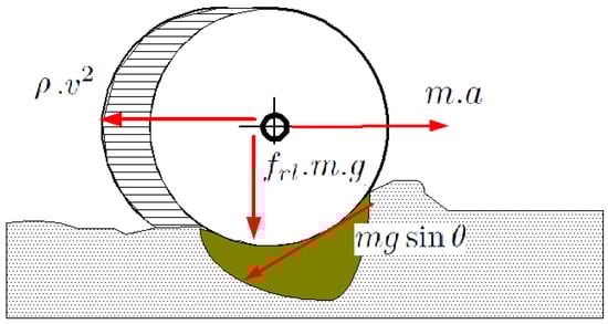 The IPC of an electric machinery can be calculated from the forces applied to the wheels [,]. As shown in Figure 4, a wheel might be subjected to rolling resistance, terrain unevenness, slippage, sinkage, aerodynamic resistance, and the wheel’s own acceleration, among other factors. Assuming that traction is electric in the EM, but the heading is mechanical, then following the guidelines presented in [,,], the resultant force on a wheel can be approximated, as shown in Equation (1).
