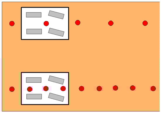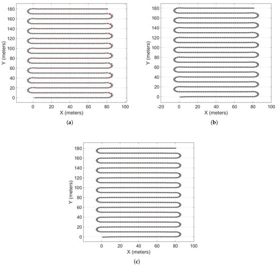 The RPP concerns, among other aspects, the path planning or motion planning of the agricultural machinery, as stated in [,,] (and the references therein). Velocity and acceleration are two of the RPP constraints that the machinery has to achieve to reach a previously-given position in the workspace or to perform a previously-known task in a given time. The former is known as trajectory tracking or path tracking. Whatever the case, the RPP starts with a path planning approach, which can be defined as a set of way-points in the workspace over which the machinery should traverse. Figure 5 shows two paths with different way-point dispositions. In the first case (top), the distance among the way-points (red dots) is greater than in the second case (bottom). The machinery though starts at the same position in both situations. Since path planning is not the core of the research, we will assume that we already have a path planning strategy. For instance, works such as [,] can provide such a path for the RPP.