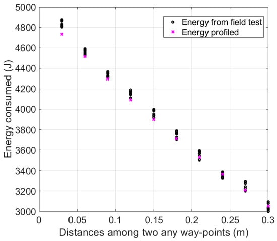 Energy assessment for ten trials, varying the distances between two consecutive way-points from the route shown in Figure 7. The black circles show the real energy measured from the EM sensors, whereas the magenta crosses represent the profiled energy for each trial.