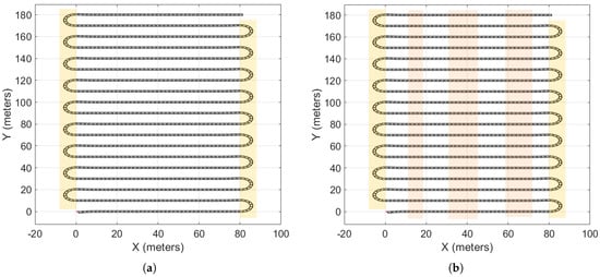 The power and energy profiling capabilities of our proposed methodology were not restricted to routes with consecutive equally distanced way-points. On the contrary, the case shown in Figure 9a is a typical maneuvering case during harvesting: when traversing through corridors, the EM speed is lower than when turning (yellow shaded areas). Thus, for this case example, and considering a 0.1-m distance between consecutive way-points in the corridors and 0.15 m in the corners, the amount of energy required to perform the task was 4034 J, approximately, and 3995 J of profiled energy. A similar case is shown in Figure 9b, where we deliberately set the distance between consecutive way-points in the orange shaded area to 0.05 m. The energy consumed was 4128 J according to our sensors, and 4050 J was the energy profiled.