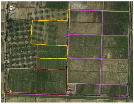 Finally, with the aim of using the advantages of our methodology for profiling IPC and energy on EMs, and based on Equation (14), we performed the trial shown in Figure 10. It shows a satellite view of the experimental farm. Following the guidelines published in [], we proposed a route to be followed by the EM, starting from and ending at the same position on the farm. The route was divided into three parts, each one with different energy constraints. The aim of the trial was to find the best and —see Equations (13) and (14)—given, previously, the available energy remaining in the EM. The method implemented for sorting and was based on a Monte Carlo approach, and it was previously published by the authors in []. It should be noted that for solving this problem, we did not consider time restrictions, but only energy constraints, as shown in Equation (14). For the red route, the energy constraint was set to 5000 J. Since such a constraint was given for the profiling stage, it was expected that the actual energy was higher, as was the case shown in Figure 7, Figure 8 and Figure 9. Our methodology found that to achieve such a constraint, the distance among two consecutive way-points had to be 0.25 m; the energy profiled was 4890 J, and after the trial, the energy measured was 5050 J, approximately. For the yellow route, the energy constraint was set to 10,000 J, the distance among consecutive way-points was found to be 0.17 m, the energy profiled was 9847, and the energy consumed was 10,120 J, approximately. Finally, for the magenta route, the energy constraint was set to 100,000 J, the distance among consecutive way-points was found to be 0.12 m, the energy profiled was 98,458 J, and 101,140 J of consumed energy. As in all experiments shown in this work, the motion controller implemented on the EM was the one presented in [].