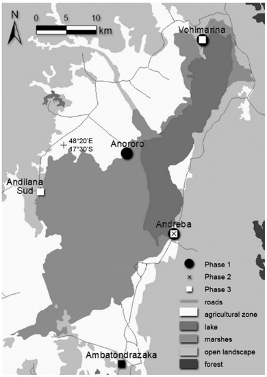 We chose three study sites around Lake Alaotra so that we could have a representation of each lakeshore as these vary substantially in terms of infrastructure, population pressure, and land use, including levels of marshland conversion and degradation (Figure 2). Andilana Sud, a village of 1074 people (2007) on the west shore of the lake, has 5700 ha of marshes that have largely been converted to rice fields, and it does not have a direct access to the lake [26]. Vohimarina, in the north and home to 1150 inhabitants (2017), has 300 ha of marshes that have been classified as showing low degradation [37]. Andreba Gare, in the south-east, had 5280 inhabitants in 2017 and encompasses 234 ha of intermediate-degraded marshes [26,37]. The secondary, paved, highway ‘Route Nationale 3a’ (RN 3a) runs along the west side of Lake Alaotra, giving access to Andilana Sud and Vohimarina, and the unpaved ‘Route Nationale 44′ (RN44) runs along its eastern side through Andreba Gare, with passage during the rainy season often being challenging to impossible.