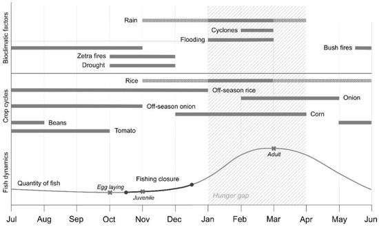 Fishing is an important activity during the hunger gap and coincides with the annual peak in fish stocks, with fish reaching maturity around March. However, with many farmers turning to this activity while there is little work to do in the fields, as well as factors such as habitat loss and destruction of breeding ground, fish stocks continue to decrease despite the annual fishing closure put into effect [25,45]. This closure suffers from a general lack of respect and is not strongly enforced by authorities [34,46,47]. Restrictions regarding the killing of small fish have been implemented by authorities and by certain fishers to encourage reproduction [46]. However, these regulations may lead certain families to no longer be able to afford this commodity [24], particularly during the hunger gap when fish sizes are at their maximum.