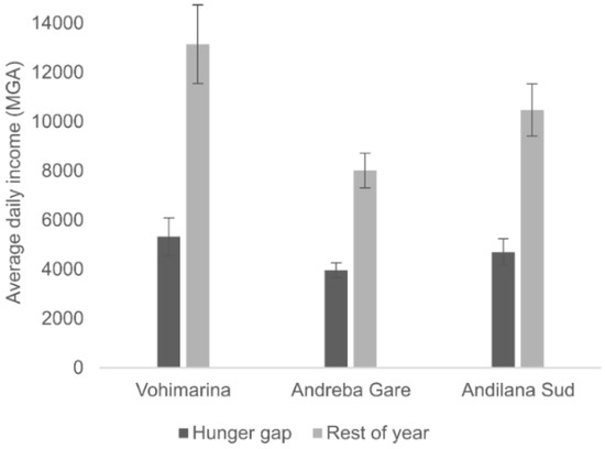 The stress of being unsure of having enough food affects not only adults but also children, some of whose parents stated that the stress leads to a deterioration of school results. Due to insufficient financial means, there is the lack of hygiene and spreading of diseases, exacerbated by the humidity and stagnant waters during the rainy season. The decrease in available produce further lead prices to increase on the market. As people have little money during this time, purchasing produce at the market is done sparingly, making it difficult for those selling to earn enough. The average daily income is halved during the hunger gap, from US$ 3.29 to US$ 1.45 (MGA10,545 to MGA4664, live market rate 1 November 2016). Comparing income between sites (Figure 5), although we do not observe a significant difference during the hunger gap at the p > 0.05 level, we do observe one for the rest of the year, with participants in Vohimarina having an average daily income 39% higher than those in Andreba Gare and 20% higher than those in Andilana Sud.