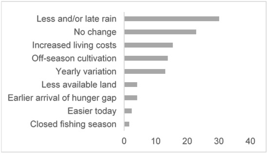 A few participants mentioned the closed fishing season that until recently coincided with the hunger gap, thereby taking away a potential source of income and/or protein. However, some participants believe the hunger gap is more bearable today than previously thanks to off-season cultivations, as well as some mentioning that there are currently more employment opportunities than in the past. Certain differences emerged across gender and sites: Significantly more men identified off-season cultivation as a change than women (p > 0.05), and although participants in Andilana Sud mentioned that arable land was becoming scarcer, this change was not identified in the other two sites.