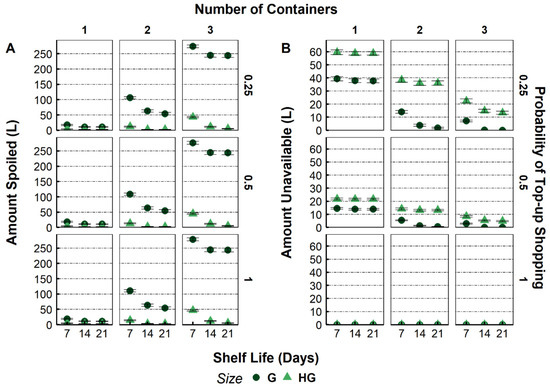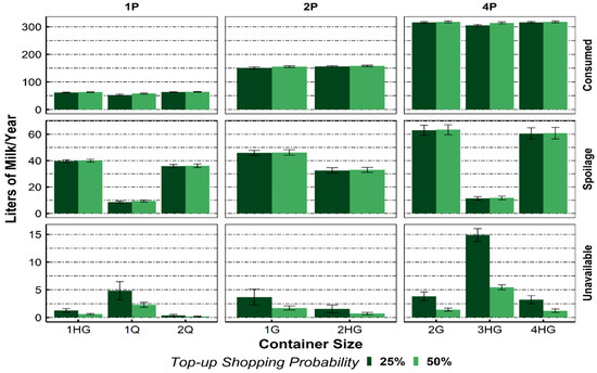 After simulating household consumption for 10,000 days (Figure A4—Appendix A), average yearly consumption was assessed to better understand how people consume based on different package sizes, shelf lives, and probability of top-up shopping. Figure 2 shows that spoilage increases with the purchase of more milk, as expected, while the amount of milk unavailable to the consumer decreases with the purchase of larger containers.