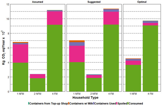 The U.S. Census estimations for 1 (32 million) and 2-person (6 million) non-family households and 4-person (15 million) family households were used to assess climate change impacts for three different package delivery systems [28]. Packaging impacts were based on the GHG emissions estimated previously for HDPE containers in the U.S. [30]; it is assumed that these households are only purchasing containers of this type. HDPE gallon and half-gallon milk containers were targeted, as they make up the largest market share 65% and 10% of total milk sales, respectively (Table A7—Appendix A). Analysis of container purchases was differentiated into three different categories: Containers used from regular shopping trips, containers purchased during top-up shopping, and containers thrown away with spoiled milk. Packaging waste was then totaled for a year representing the total GHG emissions for both consumed and spoiled milk and their disposed containers. Detailed information about how GHG emissions were calculated for 1 and 2-person non-family households and 4-person family households is provided in the supplementary information. Figure 3 shows that packaging is the smallest contributor to total GHG emissions, as previously identified by others [7,15,19].
