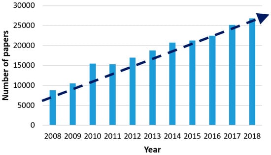 In accordance with the International Energy Agency (IEA) [1], the energy consumption of buildings is one-third of the final energy consumption globally. In particular, this energy consumption can be related to heating, cooling, ventilation and dehumidification systems. Thus, different research studies have been developed in the last few years to reduce this energy consumption. Given the importance of this topic in sustainability, the number of papers related to it is growing (Figure 1).