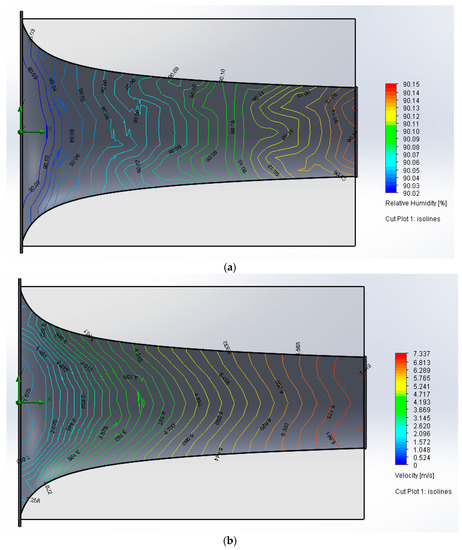 The inlet conditions—consistent with previous research works about this validation procedure [27,28,29]—were the same in the real process than in the simulation, as we can see, for instance, in the third test of Table 1 and in Figure 7, in terms of relative humidity (Figure 7a) and velocity (Figure 7b) distributions, and even in point values in the centre line.