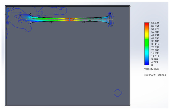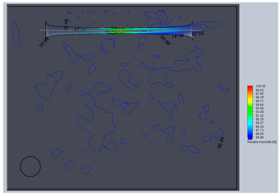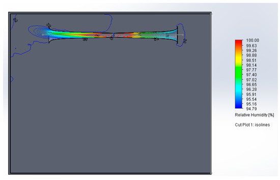 Figure 8 shows the maximum velocity value in the nozzle–diffuser throat for an inlet velocity of 5 m/s and relative humidity of 95%. The maximum relative humidity of 100% and its related moist air condensation are represented in Figure 9. This condensation process will not appear at a lower inlet relative humidity of 85%, as shown in Figure 10.