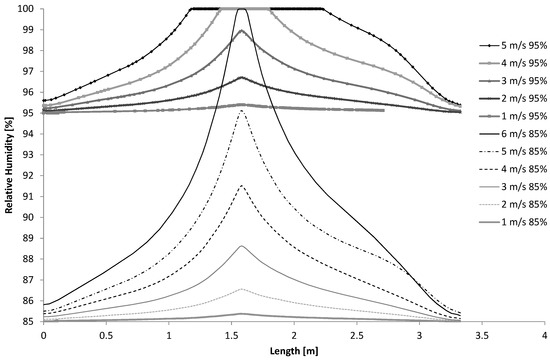 Finally, an analysis of the effect of the indoor air relative humidity and inlet velocity over the nozzle throat relative humidity values was done. To this end, different simulations of inlet velocities from 1 to 6 m/s and relative humidity values from 85% to 95% were carried out. Furthermore, its centre line values are reflected in Figure 11, Figure 12 and Figure 13, to facilitate its interpretation.