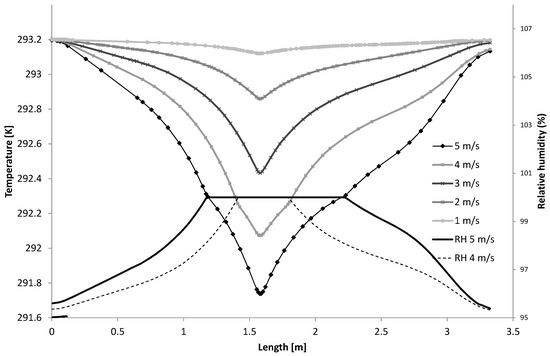 The other thermodynamic properties of the moist air in the centre line are represented in Figure 11, Figure 12, Figure 13, Figure 14 and Figure 15, which show the minimum inlet velocity needed to reach condensation (RH = 100%) for an indoor ambient relative humidity of 85% and 95%. For instance, Figure 11 shows that, when the indoor ambience has a moist air relative humidity of 95%, condensation occurs just over 3 m/s of inlet velocity. Despite this, under the previously mentioned conditions, just a punctual condensation will occur, and at 5 m/s, a stable condensation process can be observed. From this, it can be concluded that the higher the inlet velocity, the faster the throat air velocity, which will reach values over 60 m/s and, as a consequence, condensation will occur. Furthermore, more simulations show that condensation will never occur under this inlet velocity range for a relative humidity of 65% and 75%.
