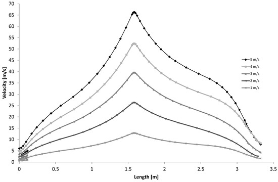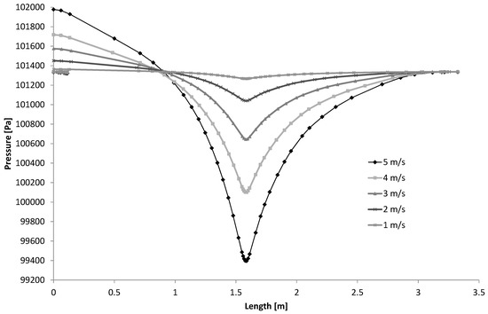 In particular, Figure 11 shows two families of curves corresponding to 85% and 95% of inlet air relative humidity and, for each family of curves, it shows the effect of inlet velocity over relative humidity in the throat (x = 1.554 m). At the same time, Figure 12 shows two families of curves: the effect of inlet air velocity over temperature at 95% of relative humidity and the relative humidity evolution through the nozzle–diffuser system for 4 and 5 m/s. This same effect is expressed as pressure in the centre line in Figure 13. Similarly, to analyse the velocity values inside the nozzle, with and without moist air condensation, and at different inlet velocities and relative humidities, more CFD simulations were done in order to show its centre line values (Figure 14).