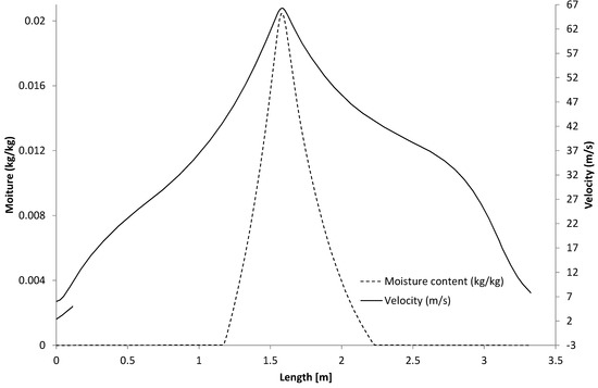 Finally, to identify the relationship between air velocity peaks in the nozzle throat and moisture content, Figure 15 includes moisture content and moist air velocity in the centre line at 5 m/s and a relative humidity of 95%.