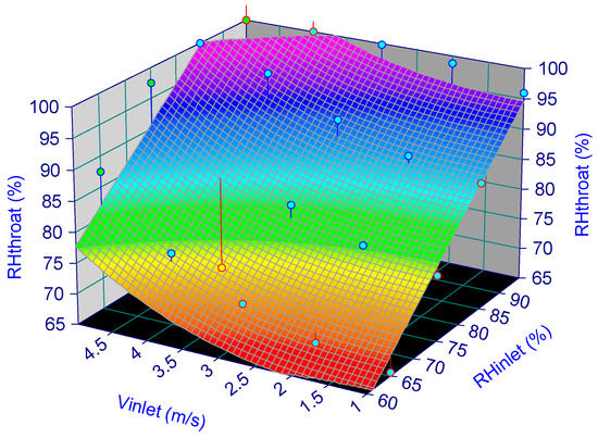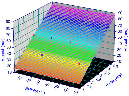 Finally, to get an initial mathematical model of this useful process, a three-dimensional curve fitting by the software Table Curve 3D® was done. This software provided the possible models in order as a function of the determination factor obtained in each case. In particular, the selected models relate the relative humidity and velocity in the nozzle inlet with the relative humidity (RHThroat) and velocity (VelThroat) obtained in the throat (x = 1.554 m), as we can see in Figure 16 and Figure 17 defined by Equations (6) and (7), with a coefficient of determination (R2) of 0.996 and 0.850, respectively.