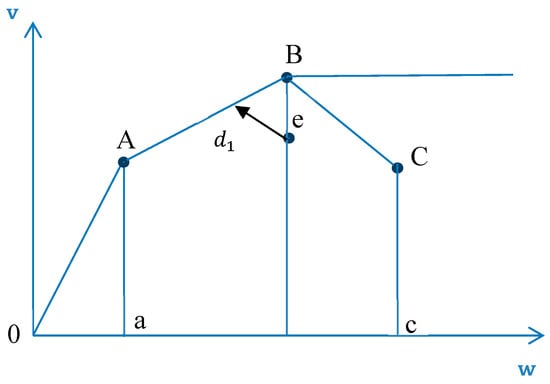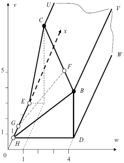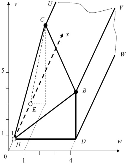 The abatement factor θ causes desirable and undesirable outputs to move together, but θ cannot satisfy weak disposability by itself. An abatement factor can make only the output move proportionally. In the Shephard technology, undesirable outputs have no directional nature because of an equality in (b) found in Equation (2). In this case, the abatement factor can let undesirable outputs follow desirable outputs if the level of production activity remains unchanged. In the case of the directional nature of undesirable outputs, as in the case of inputs, changes in desirable and undesirable outputs are proportional but in different directions. This implies that they never move together and do not have weak disposability. In this regard, Lozano and Gutiérrez combine the advantages of the Haliu and Veeman technology and the assumption of weak disposability, but as long as the inequality or slack of undesirable outputs (the equation with inequality can be transposed as that of equality by using slack.), which can move independently, exists, weak disposability cannot be reflected in the measurement. In terms of the whole measurement based on the SBM approach, a projection may head toward a benchmark point with only less undesirable outputs. Lozano and Gutiérrez fail to consider weakly disposable undesirable outputs. To impose weak disposability on the technology, the equality and the abatement factor are required. Figure 1 shows the production possibility area of the Lozano and Gutiérrez technology. The area bounded by , , and the horizontal line from B is the area under the Lozano and Gutiérrez technology. Based on a comparison of production possibility areas, the Lozano and Gutiérrez technology shows an area different from that of the Shephard technology.