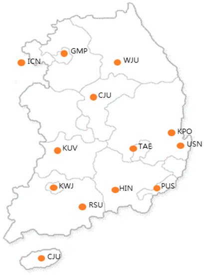 The proposed model is used to measure the efficiency of 13 Korean airports (for consistency in dataset, Muan and Yangyang airports, which opened recently or temporarily, stopped operation are excluded.) for the 2004–2013 period. (Efficiency of Korean airports, along with other Northeast Asian airports, has also been studied in, e.g., Ha et al. (2010) and Ha et al. (2013) [29,30].). But these studies did not address the issue of undesirable outputs.) The details of airports are described in Figure 5 and Table 1. Seven variables are included in the evaluation. The length of the runway (in meters), the number of employees (in persons), and the terminal area (in square meters) are considered as input factors; the number of passengers (in persons), the amount of cargo (in tons), and the number of flights are considered as desirable outputs; and the level of CO2 emissions (in tons of CO2) is included as an undesirable output. To construct "smoothed-surface" frontiers in each analysis, a measurement requires 14 observations for the seven variables (Yu, 2004 [19]), but there are only 13 observations in each year. Therefore, the validity of efficiency cannot be guaranteed. To address this problem, the three-year-window DEA method (this method is recommended by Nghiem and Coelli (2002) [31].) is adopted. This method provides efficiency trends and stability over time as well as supplements the number of observations. In this analysis, the first window (or analysis) includes the 2004–2006 period, and the last window includes the 2011–2013 period. Therefore, a total of 39 observations are included in each analysis.