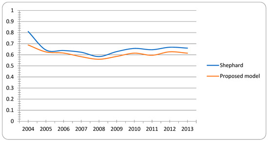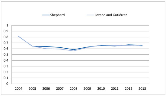 4.2.1. A Comparison between the Lozano-Gutiérrez Model and the Shephard Model