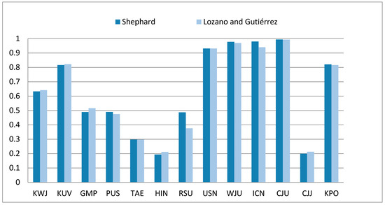 These appear in the production possibility area. There is a proportional line created by the abatement factor θ which lies in the front areas of the Shephard technology and Lozano and Gutiérrez technology graphs. The front areas have the same shape because they share something in common—the same abatement factor. The rear parts have different areas because of differences between equations of w. Spatially, the Lozano and Gutiérrez model in Equation (7) has a larger area because of the inequality, which implies that production can infinitely produce undesirable outputs like inputs. The argument of Haliu and Veeman that weak disposability and equality greatly inflate the efficiency score is considered in the same vein. However, the gap in efficiency between the Lozano and Gutiérrez model and the Shephard model is generally insignificant. Figure 6 and Figure 7 show the results for the measurement of efficiency based on the models. Figure 6 shows similar trends in efficiency, which implies that the two models show minor differences in efficiency scores over time. Figure 7 shows a chart of average efficiency by airport. Airports show slight differences between the models but there is no pattern for the differences. For example, Yeosu Airport (RSU) and Incheon International Airport (ICN) have higher efficiency scores under the Shephard model than under the Lozano and Gutiérrez model, but Gimpo International Airport (GMP) and Sacheon Airport (HIN) show the opposite results. Some airports such as Ulsan Airport (USN) show the same efficiency score between the models.
