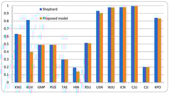 Figure 8 compares the proposed model to the Shephard model by considering weak disposability in the model and showing the efficiency trends. The proposed model has lower scores than the Shephard model for consecutive years. This verifies that multiple abatement factors include the front part of the area of the PPF, which a single abatement factor does not include, and that this found area influences the efficiency score. Figure 9 compares efficiency scores by airport. In general, the proposed model has lower efficiency scores. In particular, Gunsan Airport (KUV) shows a large difference in the efficiency score between the models. Table 3 shows the difference between the models. If the difference is less than 0, then the proposed model has a lower efficiency score than the Shephard model. Gunsan Airport (KUV) and Sacheon Airport (HIN) change by approximately 105% and 36%, respectively. These changes are caused by multiple abatement factors. This verifies that multiple abatement factors allow a technology to include an area that is not included in a technology using a single abatement factor.