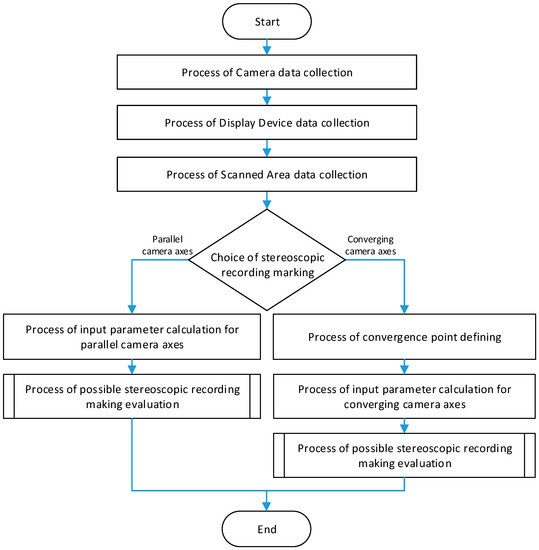 In the case of converging camera axes, the convergence point is defined. The next step was the input parameter calculation process of the camera setting in both cases. The sub-process of this process was the suitability verification of the calculated parameters and the possibility of correcting any unsuitability. As a result, the suitability evaluation of specific technical conditions for stereoscopic recording production was prepared.