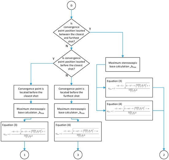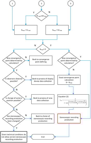 The process of the input parameter calculation for parallel camera axes option is recorded by a form of descriptive diagram (Figure 5). The process of the input camera parameter calculation enables us to calculate the maximum possible camera distance whilst maintaining the stereoscopic recording’s correctness considering the biological requirements for human spatial vision. The formula for bmax Equation (1) is completed by a value of the maximum recommended observation angle of 1.5° value.