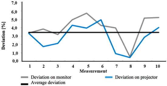 Deviation values are divided into two groups (depending on the display device) due to a better graph clarity. The total average deviation of measured values is 3.4%, compared to theoretical values. Such deviation value could be considered as sufficient enough for the verification and validation of derived formulas.