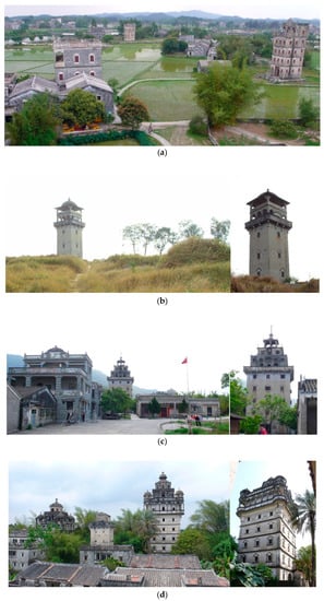 Kaiping is a city near the southern center of the Guangdong Province in China. The construction of Diaolous in Kaiping City can be traced back to the Ming Dynasty when the rural settlements needed such buildings to resist bandits and robbers [35]. From the end of the Qing Dynasty to around 1930, Kaiping was a famous hometown of overseas Chinese, and local villagers were relatively wealthy due to a lot of remittances from overseas. The villages were thus vulnerable to be attacked by bandits, and the construction of Diaolous sharply increased in this period for defending against rampant bandits. After the establishment of new China in 1949, no more Diaolous were built because the numbers of bandits significantly decreased, and the villages became safer. The Diaolou landscape thus becomes an important cultural heritage as a defensive settlement in history.