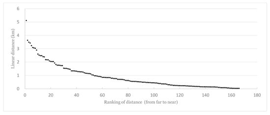 Figure 3 shows the calculation process of delineating the areal boundary of defensive regions based on spatial analysis toolkits on the software of ArcGIS 10.4. The first step is to draw the Thiessen polygons of each Genglou in Kaiping to allocate the village space to the nearest Genglou. However, not all the places within a Thiessen polygon can be supervised by the Genglou, because the defensive scope of the Genglou is limited. Thus, in the second step, we need to figure out the largest defensive distance from a Genglou and provide the buffer areas based on the distance. According to the building history of Genglous, a newly-added Genglou often selected a site an “appropriate distance” away from nearby existing Genglous. The “appropriate distance” is identified mainly based on two principles. First, the new Genglou aims to extend the entire defensive scope to the largest extent. Second, there should be an overlap between the defensive scope of the new Genglou and those of other existing Genglous in order to keep all surrounding areas under supervision. Based on these principles, we calculate the linear distance of each Genglou to their nearest neighborhood Genglous in the ArcGIS and visualize them in descending order in Figure 4. After removing the outliers, the maximum nearest neighbor distance is about 3.6 km, so the largest defensive radius of Genglous is set at 1.8 km.