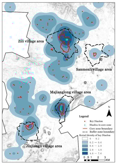 Delineation of current protection scopes and construction control zones of KDVs mainly depends on a Diaolou’s agricultural value. Figure 5 shows four sites of existing preservation scope delineated by the WHC, including Zili Villages, Sanmenli Village, Jinjiangli Village, and the Majianglong Village Cluster, as well as their surrounding buffer areas. We perform a kernel density analysis based on the spatial distribution of the Diaolous with first-class architectural value, which is identified by an official document from the Protection and Management Plan on Kaiping Diaolou and Villages 2001. The document divides Diaolous into five categories by historical significance, architectural art value, and actual state, with the first category recognized as first-class, key buildings for protection. As shown in Figure 6, the Zili Villages area, Jinjiangli Village area and Majianglong Village Cluster area are in the dense areas with high architectural value, and the Sanmenli Village area is delineated mainly to protect the earliest Diaolou, that is, the Yinglonglou Building.