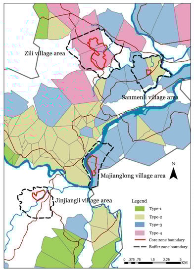 In contrast, Figure 7 shows the types of defensive regions defined in the previous section, overlapped with the four existing conservation zones delineated by the WHC. The conservation zone in the Zili village area includes two Type-4 defensive regions; the Sanmenli village area has a Type-2 and a Type-3 defensive region; the Majianglong village area covers two Type-3 regions; the Jinjiangli village area is in the area without any public defense. Therefore, the existing conservation zones neither consider the integrity of the typology of defensive functions, nor scrutinize the integrity of the boundaries of defensive regions. For example, the existing protection scopes do not cover all types of defensive zones; Type-1 defensive regions are not included. Also, the existing conservation zones of Zili Village, Majianglong Village and Jinjiangli Village cut the integral defensive regions into pieces, breaking the rule of intactness.