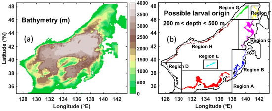 Model domain. (a) Bathymetry in the Sea of Japan; (b) Possible spawning sites of snow crab, determined by water depth in the range of 200 m to 500 m.