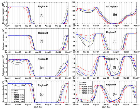 When comparing seasonal variations among experiments, minimal decline was found in the regions south of 41.5° N in the future (Figure 2, left panel). In contrast, spawning in region C increased remarkably in future spring, with larger increments under the RCP8.5 scenario (Figure 2d). In regions F, G, and H (Figure 2f,h), the spawning peak in spring shifted forward, while that in autumn shifted backward, showing the phenological effects of warming [19]. For example, the spring peak in region H occurred on 10 June in the 1960s and was advanced 10 days in the 2010s and another 10 days/30 days in the 2100s, under the RCP2.6/RCP8.5 scenarios (Figure 2h).