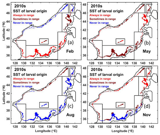 Seasonal variation of the SST range classification in 2010s. (a) February; (b) May; (c) August; and (d) November. Red dots indicate that the SST in those grids always fell within the range of 5 °C–16 °C; brown indicates the SST may have been out of range in some years, and blue means the SST never fell in the range during 2009–2013.