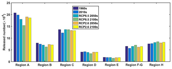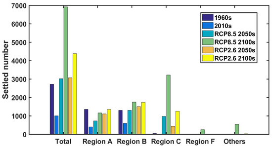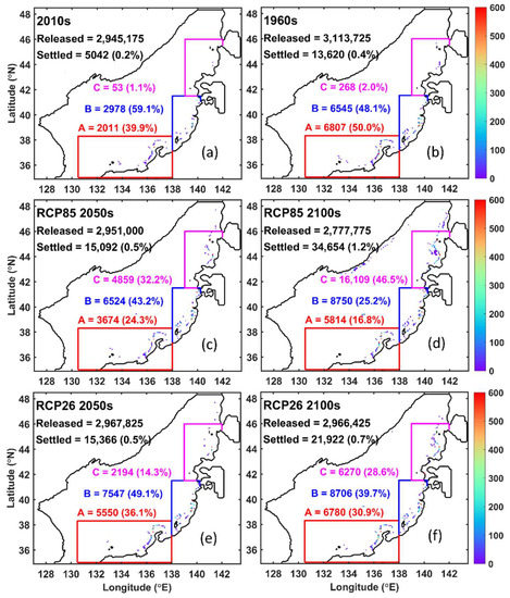 After release, the crab larvae were advected by the cyclone-like circulation in the Sea of Japan, mainly consisting of the Liman Current, the North Korea Cold Current, the Ulleung Eddy, and TWC [46], and sank. In the later megalopa stage, some larvae settled on the seabed off Honshu and Hokkaido Islands (regions A, B, and C; Figure 6). The fewest number of larvae settled in the 2010s. The settling rate, i.e., the ratio of settled larvae number to initially released number, was also the lowest one in the 2010s. Among the settlement, 99% occurred in regions A, B, and C. However, in RCP8.5 2100s, this percent decreased to 88.5% because some megalopa settled on the seabed north of 46° N in region F, while others settled along the coast in region H and a few settled in region E (Figure 6d). Additionally, the gathering site of settled megalopa shifted northward as climate changed. The highest settlement proportion occurred in region A in the 1960s, but shifted to region B in the 2010s. From then on, region B exhibited a steady decline. As a result, the settlement proportion in region C increased by 27%(RCP2.6)–45%(RCP8.5) in the 2100s.