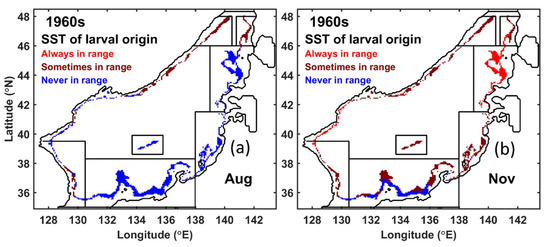 Unexpectedly, the spawning amount in the 1960s was higher than today in most regions. The seasonal variation depicted in Figure 2 indicated a distinct increase in November in regions A and B and in August–September in regions F and G. A comparison of SST range classifications between the 2010s and 1960s (Figure 3c,d and Figure 5a,b) provides clarification for these unexpected results. More particles were released from region F in August and from region A in November in the 1960s than in the present period.
