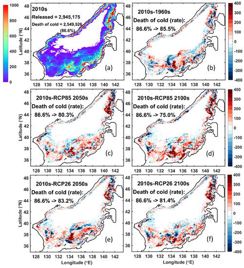 In addition to the departure from the Sea of Japan through the Tsugaru Strait and the Soya Strait, four final states of the larvae were identified, i.e., death due to low or high temperatures, drifting in the ocean, or settlement on the seabed (Table 3). In the future experiments, increased settlement resulted from a decline in the low-temperature (<5 °C) mortality rate. A 1%–3% decrease in mortality can result in a 1–2 time increase in settlement amount. Spatial distribution analysis indicated that low-temperature mortality drastically decreased in the southern Sea of Japan (typical area: 134–136° E, 36–38° N) and in northwest Hokkaido in the future experiments (Figure 8). For example, as shown in Figure A3, water with temperature >5 °C in the southern Sea of Japan was more abundant in RCP2.6 2050s than in the 2010s. A similar discrepancy in water temperature was observed for low-temperature mortality distribution (Figure A3c and Figure 8e).