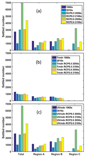 As mentioned in Section 2.2.2, the “Tmodern” and “UVmodern” groups were run to separate the effects of changes in water temperature or changes in flow field. The difference in settlement between “Tmodern” and “control” was more distinct than that between “UVmodern” and “control” (Figure 9), suggesting the dominant impact of water temperature in the Sea of Japan. This influence was observed in all periods from the past to the future. For example, the annual settlement in region B, under scenario of RCP2.6 2100s, was reduced from 1740 in “control” to 322 in “Tmodern”, but increased to 2093 in the “UVmodern” group. This indicated that a 1.4 °C increase in water temperature under the high mitigation scenario of RCP2.6 would increase larval settlement by five times and reveals the rectification of flow field on the distribution of larval settlement. As Figure A2 shows, FBTWC in the 2010s was stronger than that in the RCP2.6 2100s, with a southerly weaker joint current of SBTWC and TBTWC. Therefore, the settlement in region B was a little higher in “UVmodern” than in “control”.