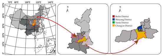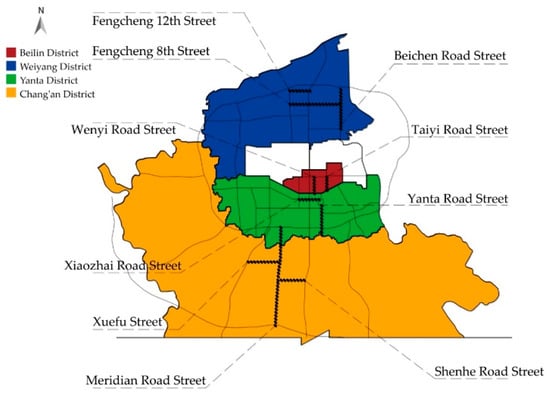 Sample data were collected from May 17 to July 20, 2018 in the following districts and counties in Xi’an administrative region of Shaanxi Province, including Beilin District, Yanta District, Weiyang District and Chang’an District, as shown in Figure 2. The specific investigation sites are Beichen Road, 8th Fengcheng Road, 12th Fengcheng Road, Taiyi Road, Wenyi Road, Xiaozhai Road, Yanta Road, Ziwu Avenue, Shenhe Avenue and Xuefu Avenue in Weiyang District, as shown in Figure 3. After screening samples among 400 questionnaires, we deleted 75 questionnaires that do not meet our requirements, including questionnaires with unclear writing, wrong information and damage et al. According to the suggestion of Hair et al. [], in the process of structural equation modeling, the ratio between sample number and observed variable number should be 1:10–1:15, and based on the number of observed variables in this paper, the appropriate sample number should be 200–400. All the questions in this questionnaire are stated in statements. The respondents are asked to choose the degree of recognition of the questions in the questionnaire according to their actual situation. In this questionnaire, at least three observation variables (questions) are set for each potential variable (facet). The answer options in the questionnaire were measured by a Likert scale. Scores ranged from small to large, indicating that the degree of recognition ranged from low to high, specifically 1 (total disagree), 2 (disagree), 3 (slight disagree), 4 (uncertain), 5 (slight agree), 6 (agree), 7 (completely agree).