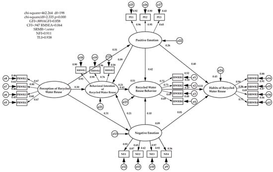 Table 11 is the path coefficient table for the structural model. According to the path coefficient of the model in this table, the corresponding research hypothesis is tested. According to Table 11, it can be found that the positive emotion of recycled water does not have significant effect on the behavioral intention of recycled water reuse, and the negative emotion of recycled water has no significant effect on the behavior and habits of recycled water reuse. In addition, other paths in the structural equation model are significant.
