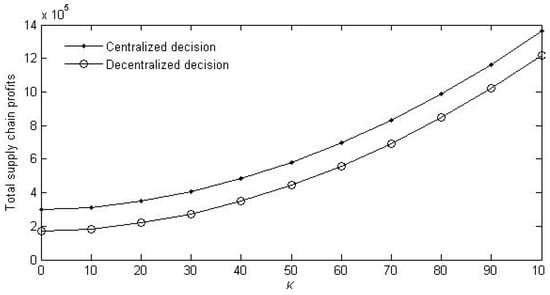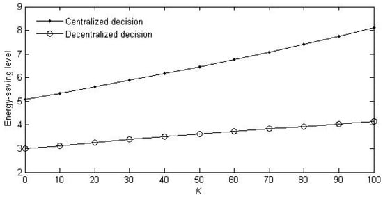 From this analysis, we can infer that the result of the centralized decision-making supply chain is more nearly ideal. However, in reality, it is very difficult to achieve a completely centralized decision-making situation. Enterprises will always choose the most appropriate mode of operation according to their own operating conditions and needs and will make decisions independently. If manufacturers and retailers both make decisions in this manner, then the total supply chain profit is less than the total under centralized decision making, which results in a double marginalized effect. Moreover, under decentralized decision-making, the energy-saving level of the products and the market demand for the products are both lower. Thus, decentralized decision-making not only decreases overall profits, but it also fails to motivate manufacturers to improve the energy-saving level of their products. To solve these problems, it is obviously necessary to introduce other measures to coordinate the whole supply chain.