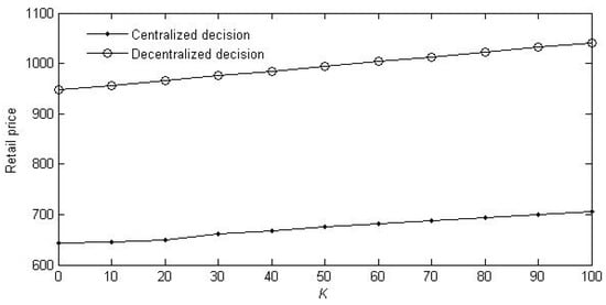 Proof. The retail price of energy-saving products in the centralized decision-making situation is subtracted from the retail price of energy-saving products in the decentralized decision-making situation to determine the price difference between these contexts, as follows: