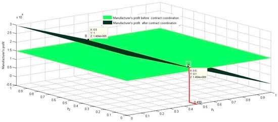 Proposition 5. In the process of coordination of the supply chain, by means of a revenue-sharing contract, manufacturers and retailers can adjust the value of the contract parameters to determine the profit distribution within the supply chain. In this model, increasing the values of the contract parameters µ1 and µ2 gradually decreases the manufacturer’s profit while increasing the retailer’s profit proportionally.