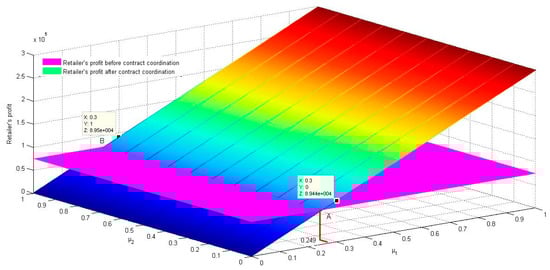 According to the contract, the coordinated contract can only be promoted when the total profit of the manufacturer and the retailer is greater than that with the decentralized decision, that is, πmdc* > πmd* and πrdc* > πrd*.