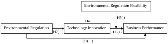 In the field of ER and business performance, the most representative study is that of Porter (1991) []. He suggested that the strict and appropriate ER could promote technology innovation, thereby offsetting ER costs for enterprise and improving business performance, thus creating a “win-win” result for the improvement of environment and business performance. So far, this view has been widely discussed and is acknowledged as the Porter hypothesis (PH). However, an increasing number of studies have indicated that ER is not conducive to the improvement of business performance, because enterprises will have to spend extra funds when addressing ER [,].