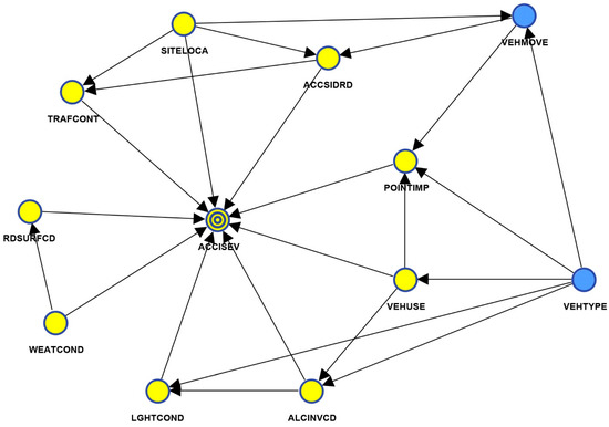 In Figure 1, each circle represents a node. Accident severity (ACCISEV) denotes the target node. Yellow nodes represent the variables (POINTIMP, SITELOCA, ACCSIDRD, LIGHTCOND, TRAFCONT, ALCINVCD, VEHUSE, WEATCOND, and RDSURFCD) directly affecting the accident severity. Blue nodes stand for the variables (VEHMOVE and VEHTYPE) that have an indirect influence on the target node. An arc is related to the conditional dependencies between variables.