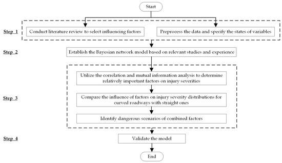 Over the past few years, Bayesian networks have gained increasing popularity among safety analysts, and have become one of the most effective ways to determine relationships between accident severities and influencing factors [23,24]. Zhao, Wang, and Qian [25] discussed the elements that influence hazardous transport crashes by establishing a Bayesian network model with the aid of expert knowledge. Chen et al. [26] developed a hybrid approach based on multinomial logit models to comprehensively explore accident severities in the cases of rear-end accidents. Mbakwe et al. [27] combined Delphi method with Bayesian networks for discovering the characteristics of highway road accidents and predicting accident occurring frequencies. Theofilatos [28] found traffic variations exert a dramatic effect on accident occurrence in urban arterials using Bayesian logistic regression.