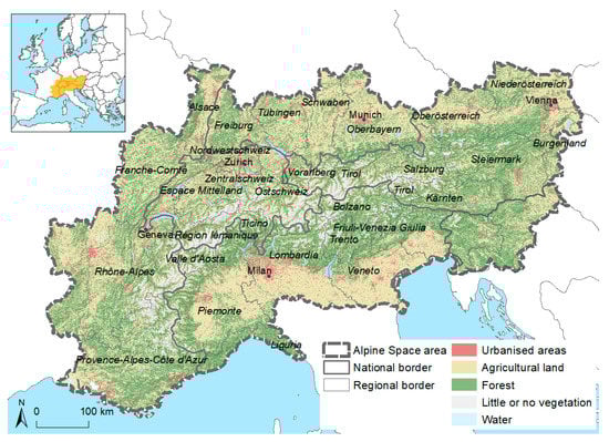- Tappeiner, U.; Borsdorf, A.; Tasser, E. Alpenatlas: Society, Economy, Environment = Atlas des Alpes = Atlante delle Alpi = Atlas Alp = Mapping the Alps; Spektrum, Akad. Verl.: Heidelberg, Germany, 2008. [Google Scholar]